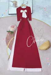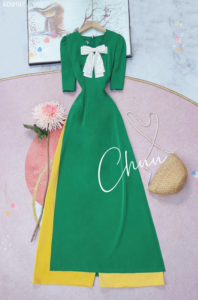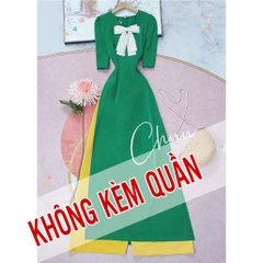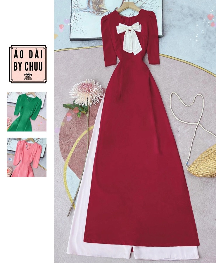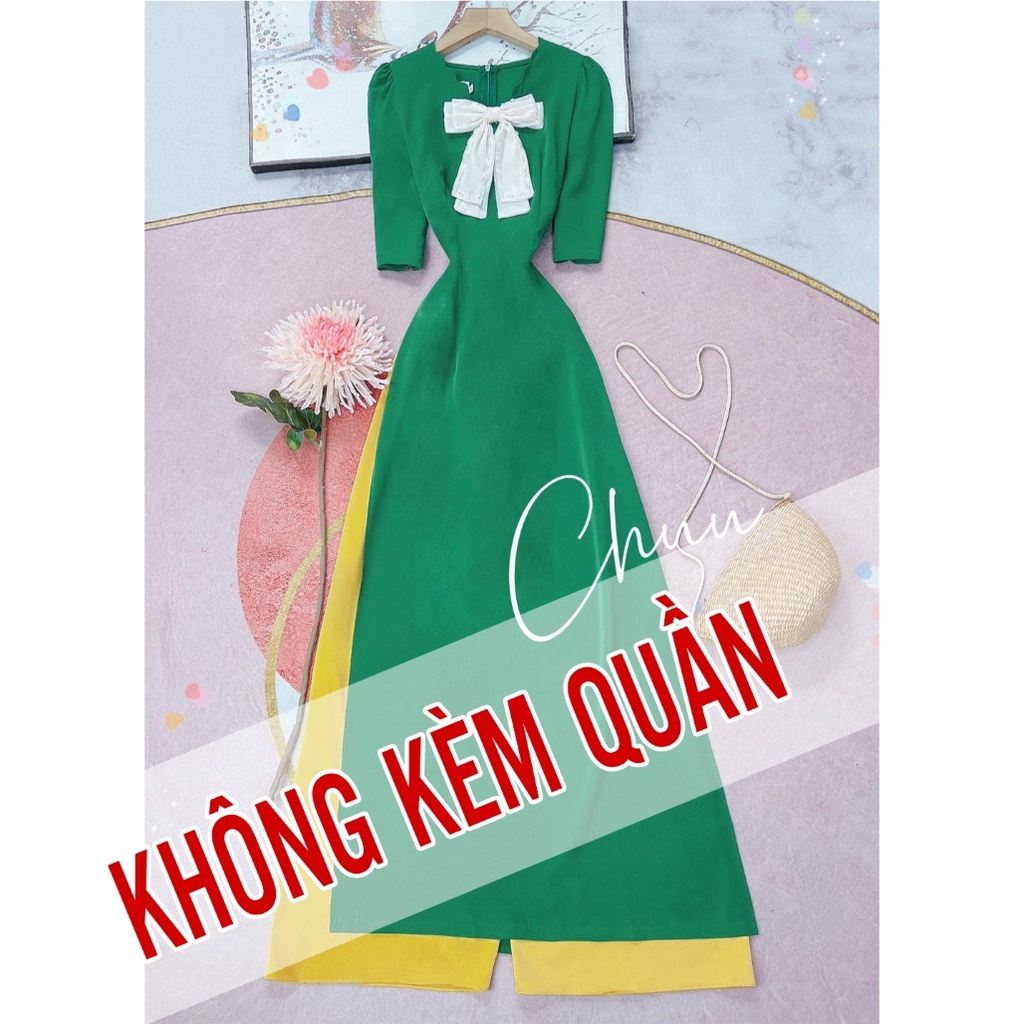 - Áo dài công sở trơn cổ lượn sóng kèm nơ kem xinh xắn