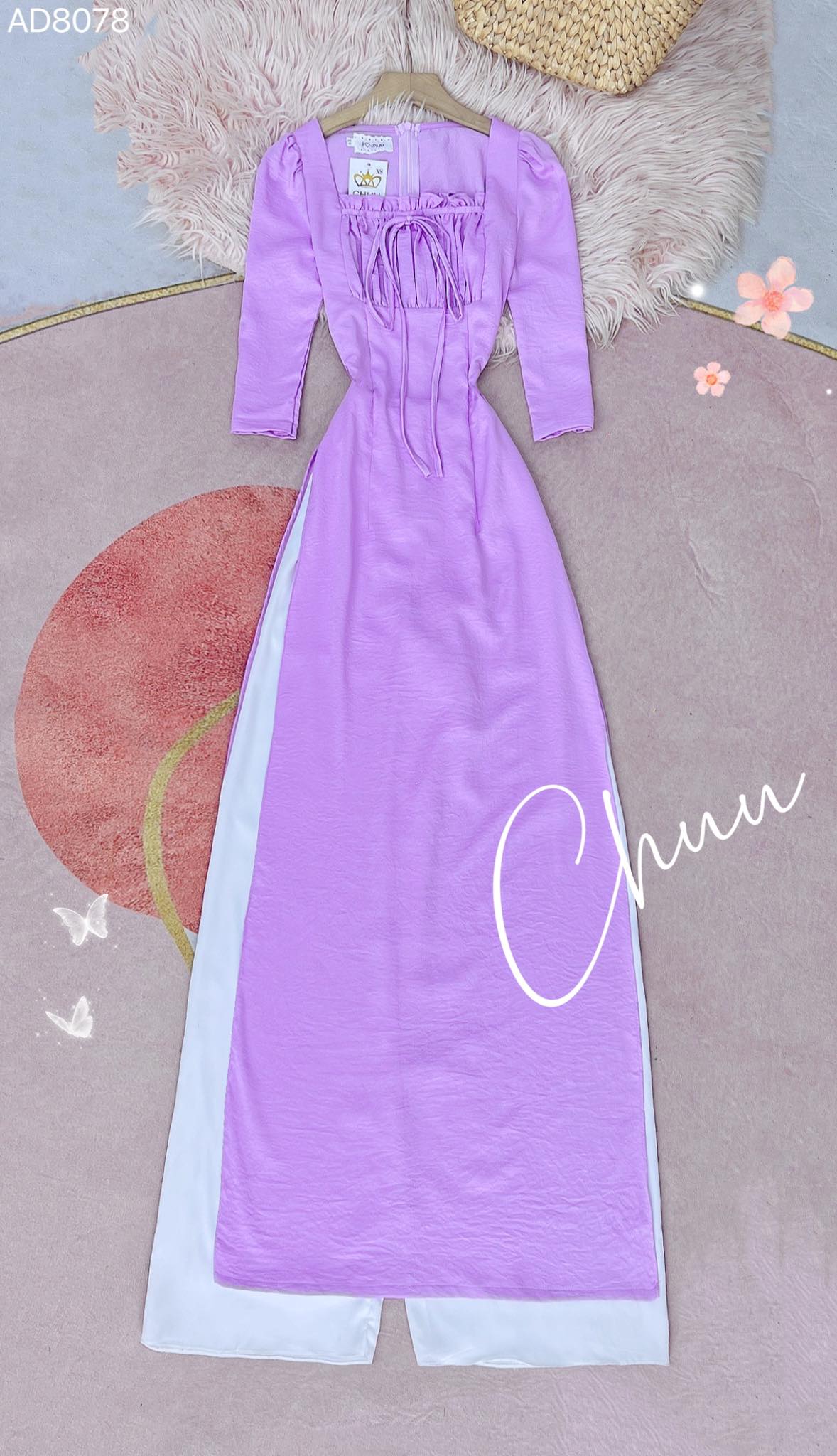 -Áo dài cổ vuông (trơn) được may bằng vải lụa ướt tạo cảm giác mềm mượt khi mặc
