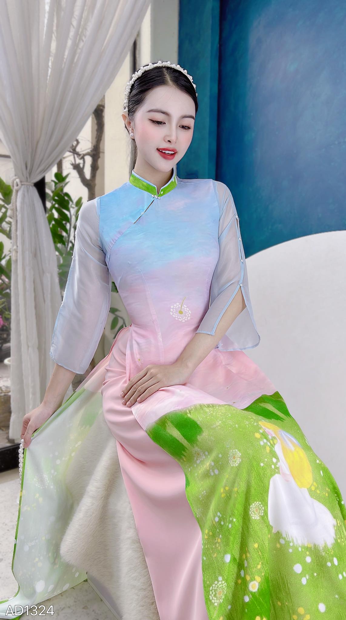 - Áo dài truyền thống in họa tiết cánh đồng xanh mướt là điểm nhấn thêm xinh xắn