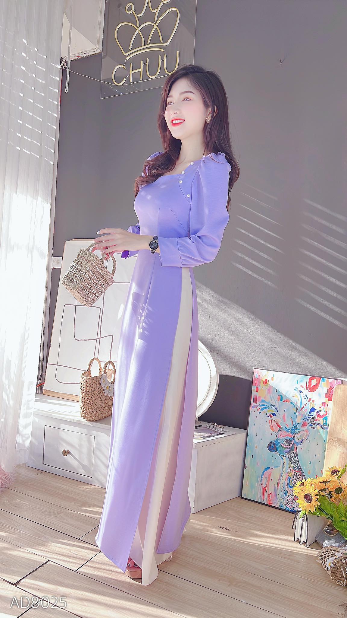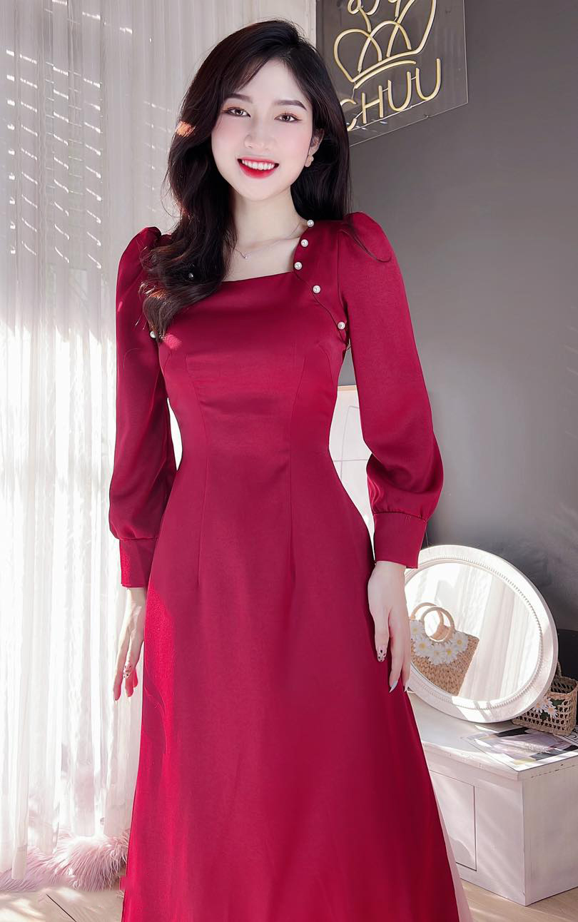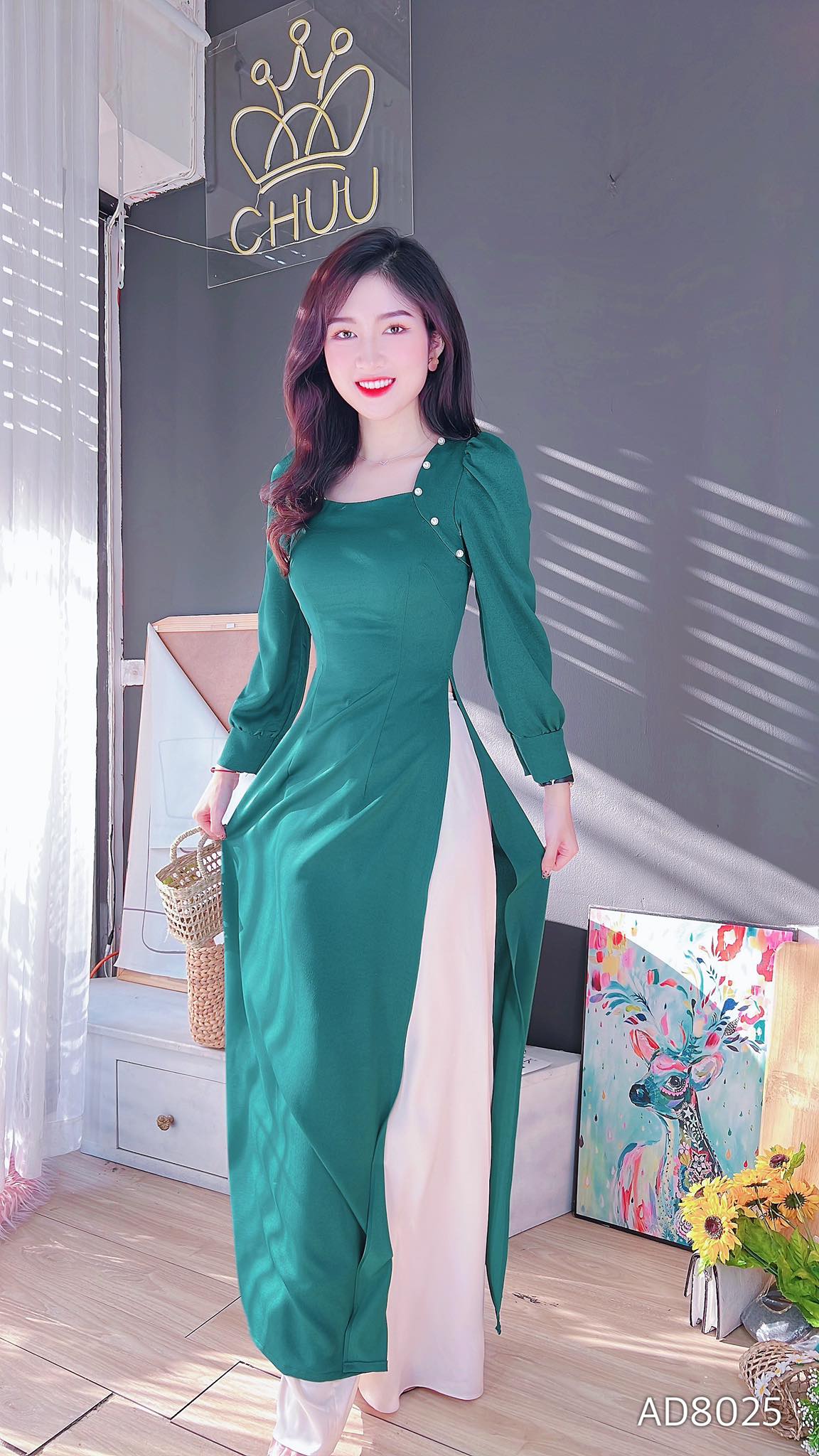 - Áo dài công sở trơn cổ vuông đính ngọc quyến rũ