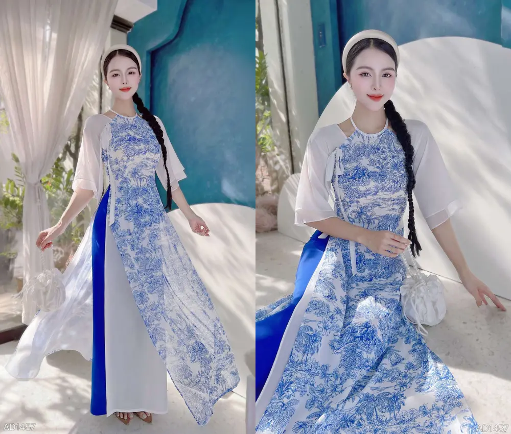 2.5. Áo dài trắng xanh cut vai tay đôi