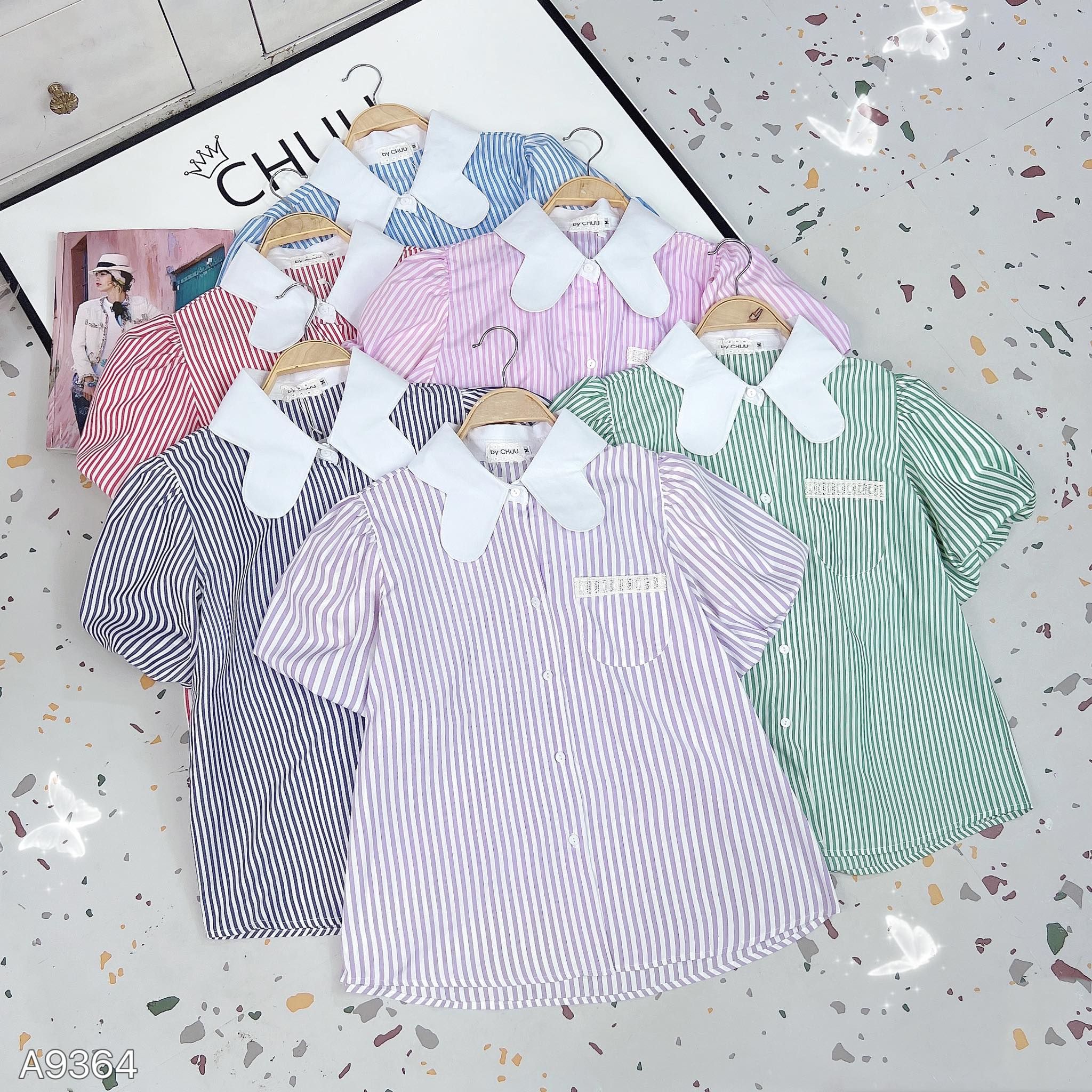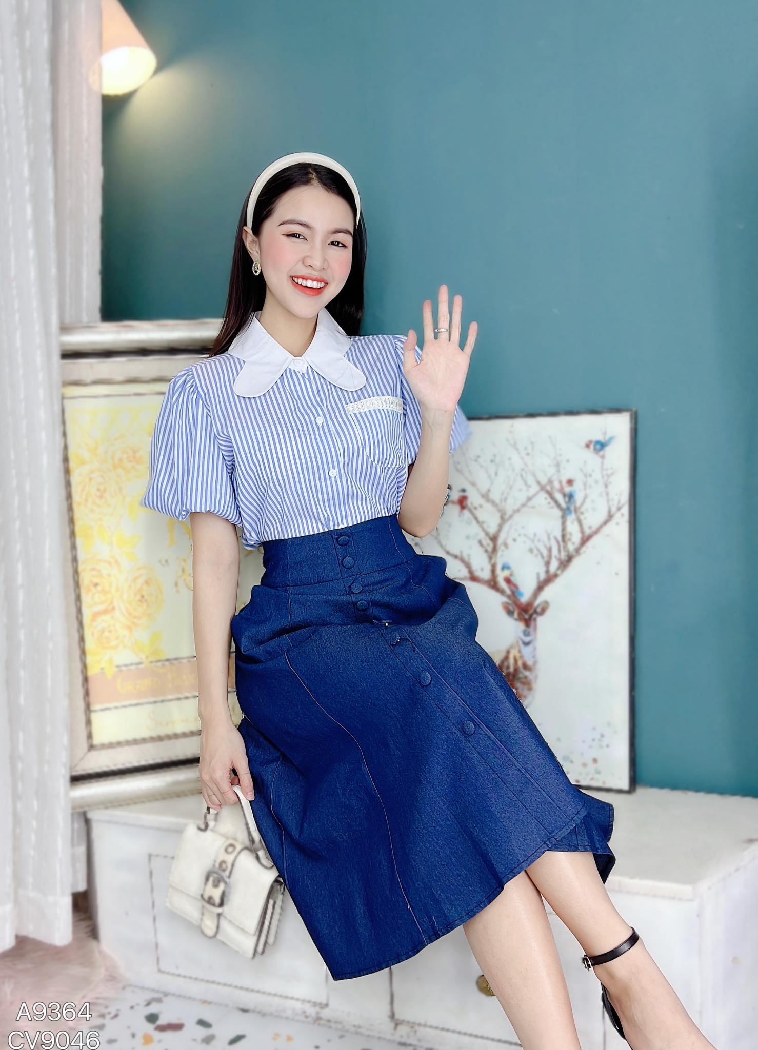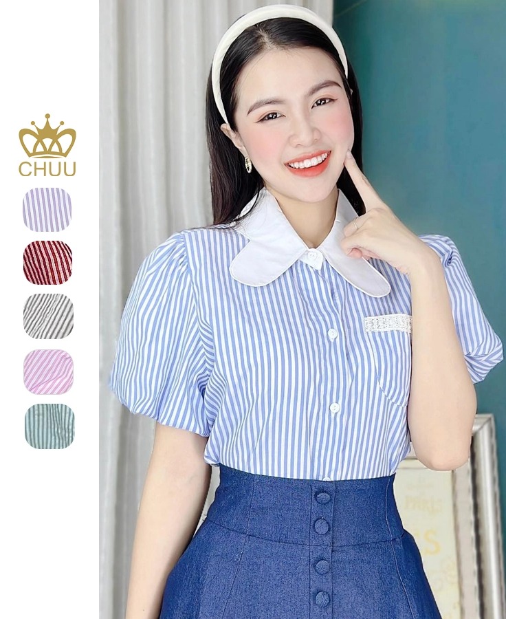 - Áo sơ mi tay ngắn phồng bồng bềnh giúp che khuyết điểm bắp tay cho chị em
