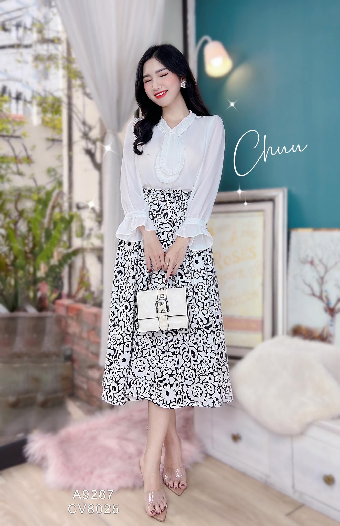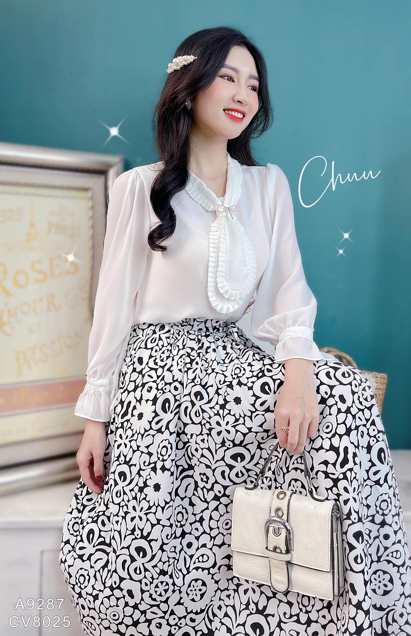 - Áo sơ mi tay dài phồng loe giúp che khuyết điểm bắp tay cho chị em