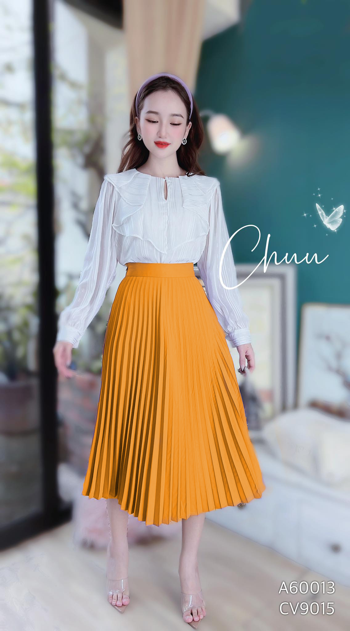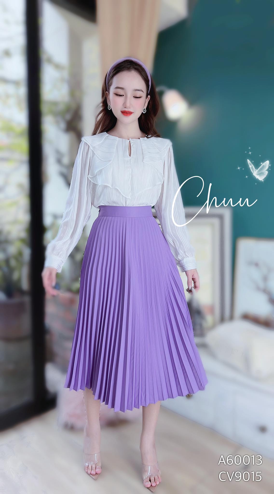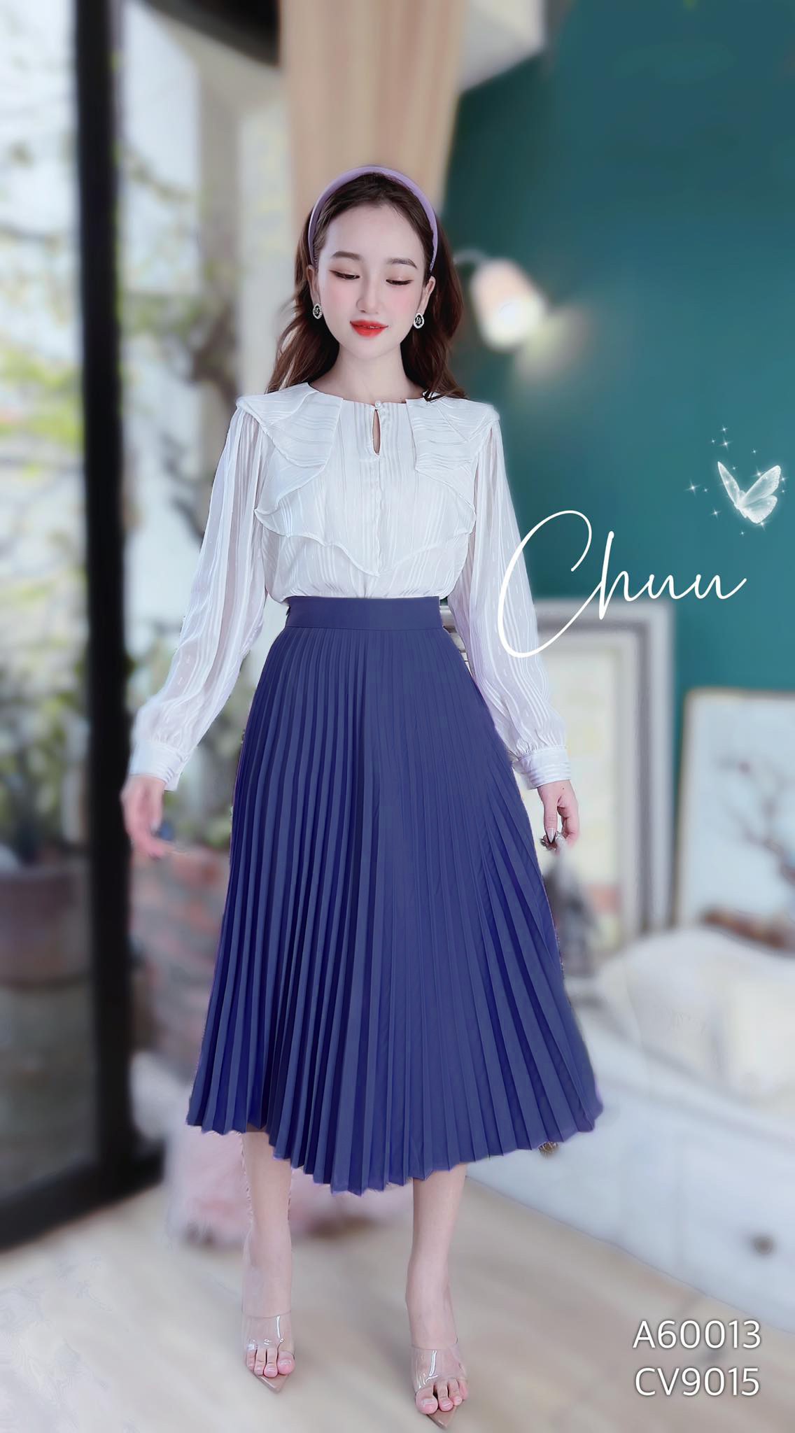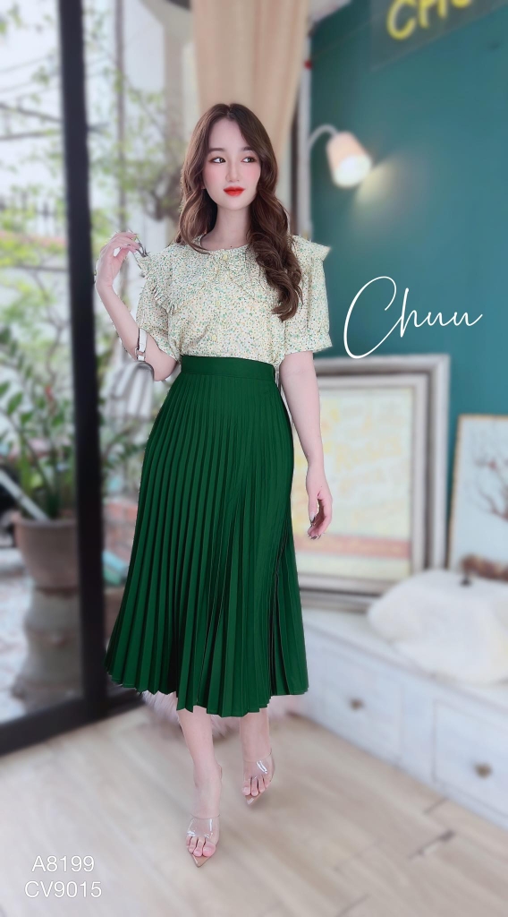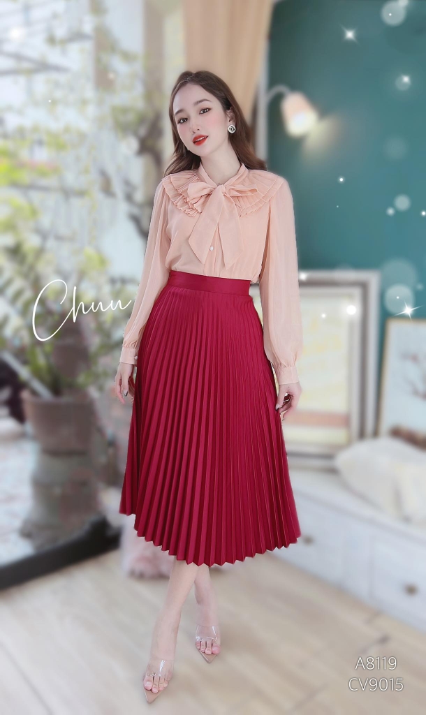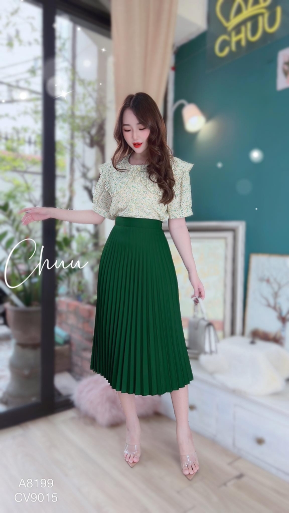 - Thiết kế chân váy xếp ly dáng xòe, dài qua gối thanh lịch