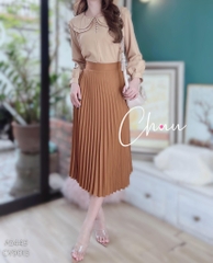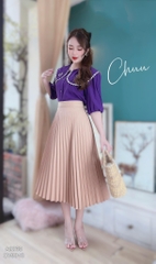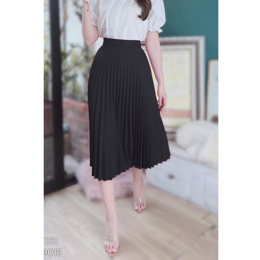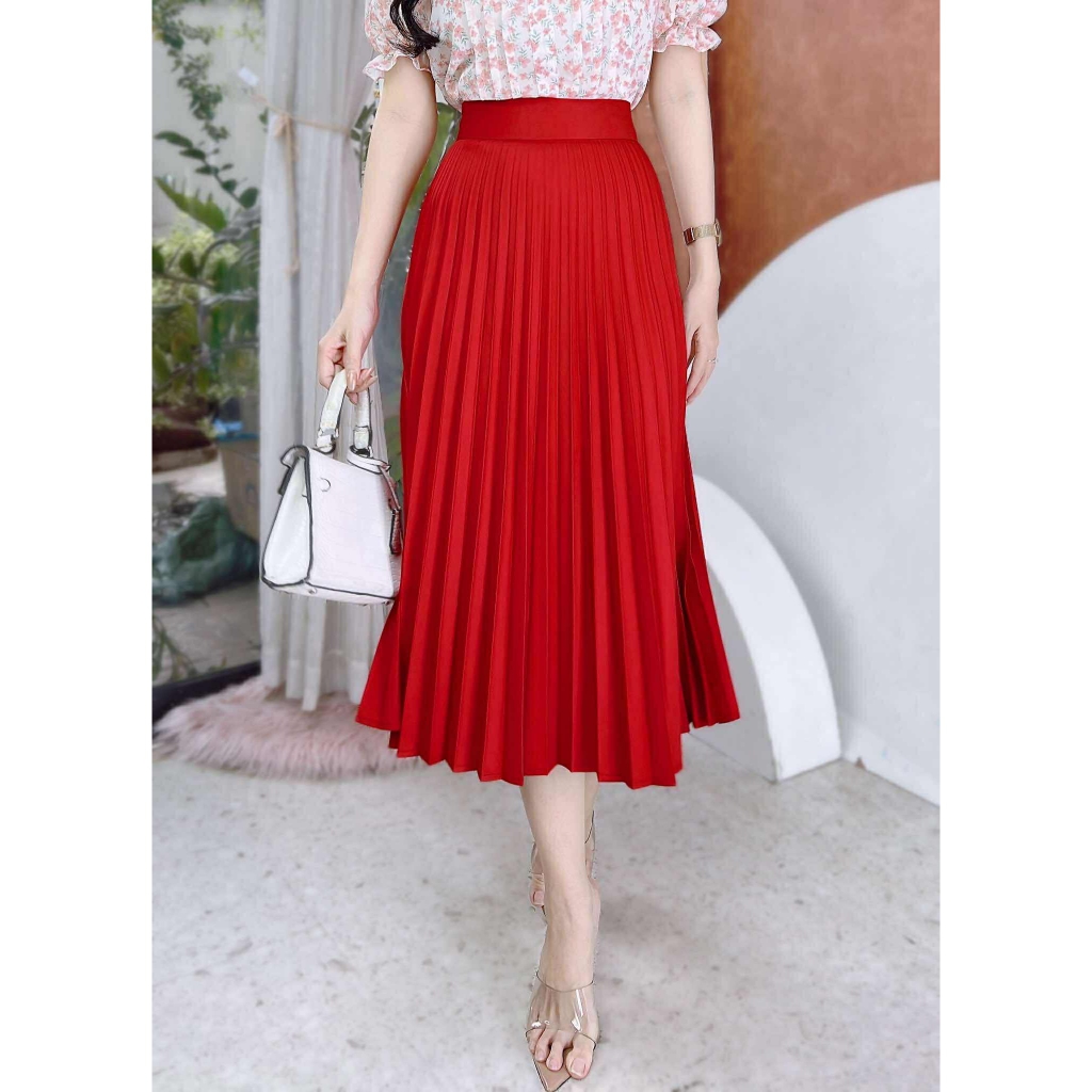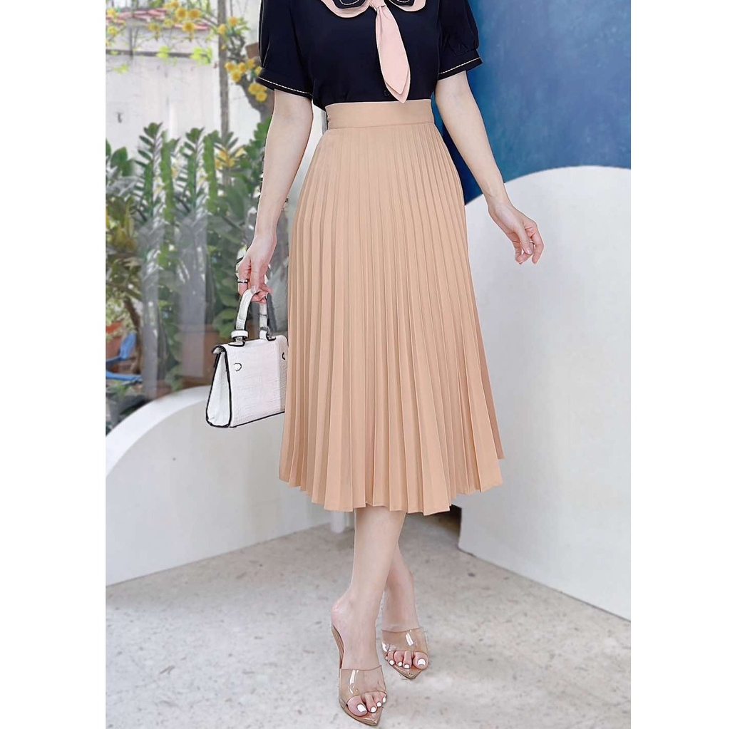 - Váy midi xếp ly rất dễ phối cùng áo sơ mi, áo thun để đi làm, đi dạy hay đi chơi đều phù hợp