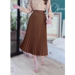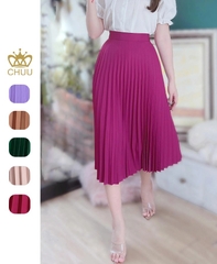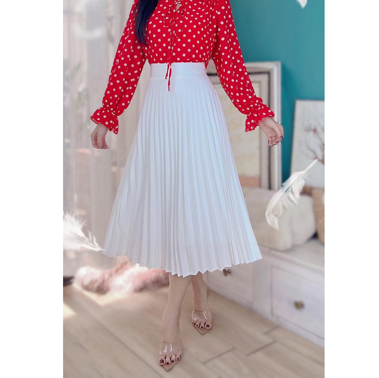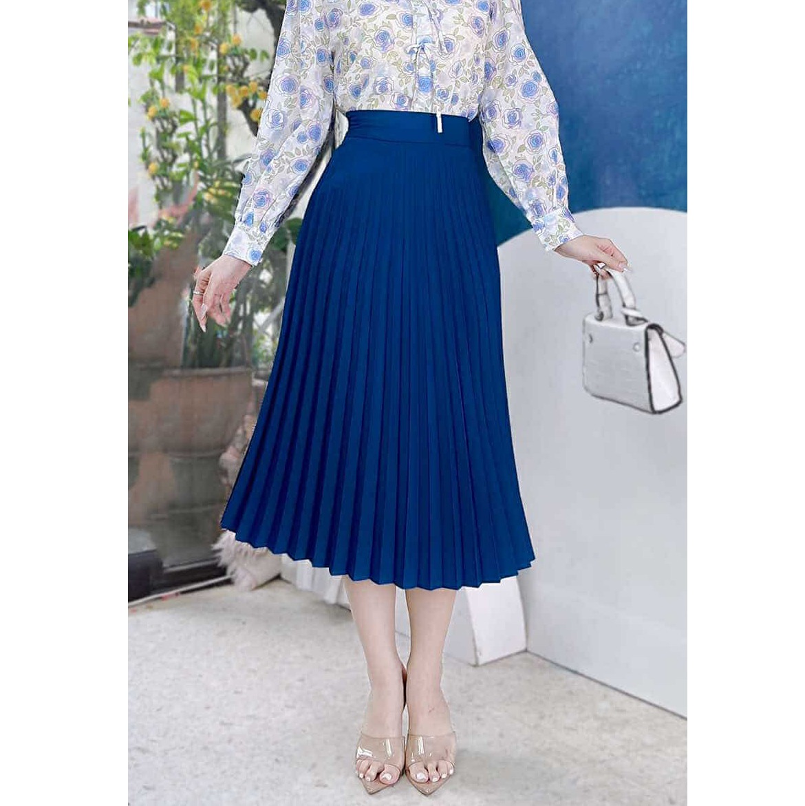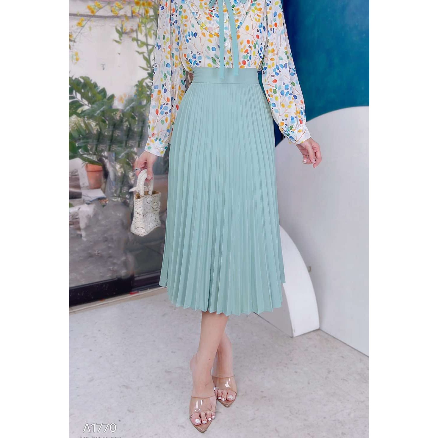 - Váy midi xếp ly rất dễ phối cùng áo sơ mi, áo thun để đi làm, đi dạy hay đi chơi đều phù hợp
