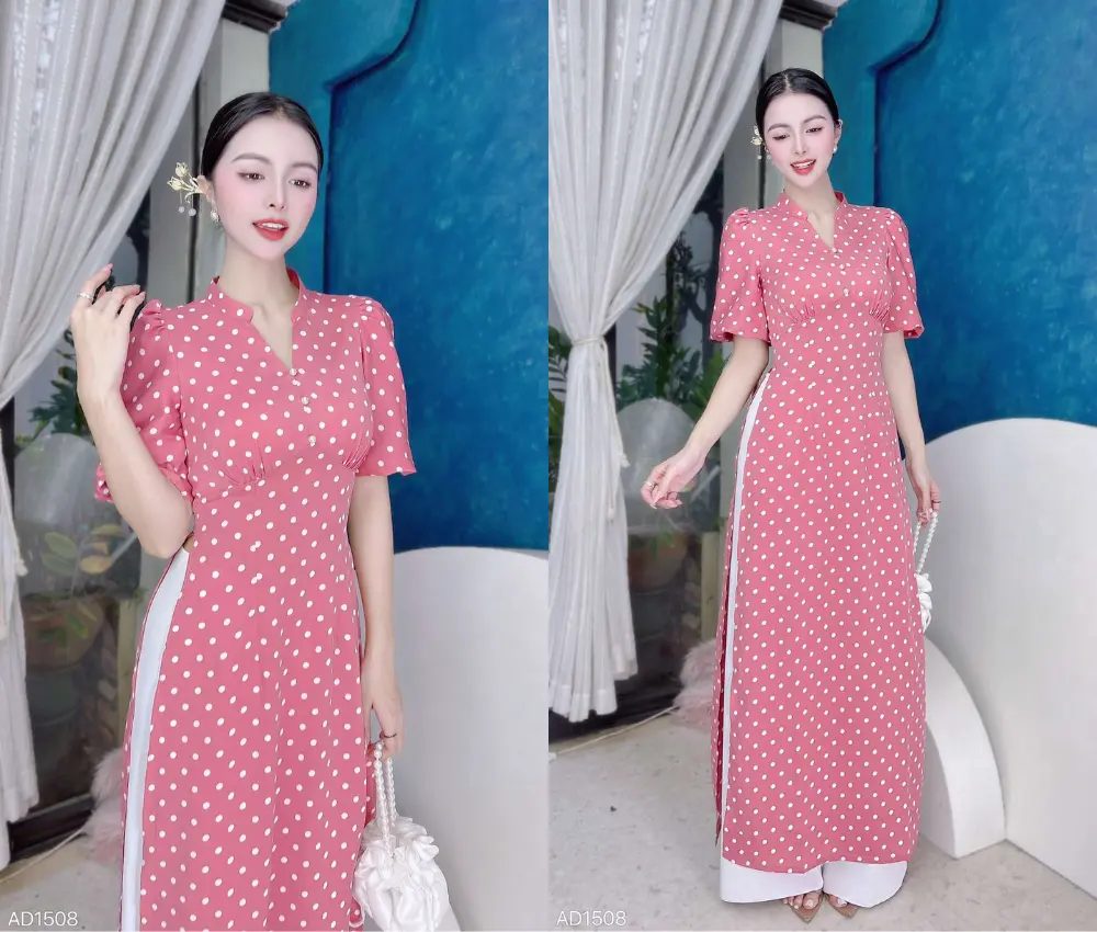 Áo dài suông cách tân cổ kim cương bi toát lên vẻ đẹp tươi trẻ và hiện đại với họa tiết chấm bi trắng trên nền hồng, vừa thanh lịch vừa năng động. Thiết kế cổ chữ V cách điệu mang lại sự thanh thoát và hiện đại, kết hợp với tay áo bồng nhẹ tạo nên nét nữ tính, duyên dáng. form dáng suông thoải mái giúp tôn lên đường cong tự nhiên mà vẫn mang lại sự thoải mái, phù hợp cho các sự kiện trang trọng hoặc dịp thường ngày, giúp người mặc tự tin và rạng rỡ.