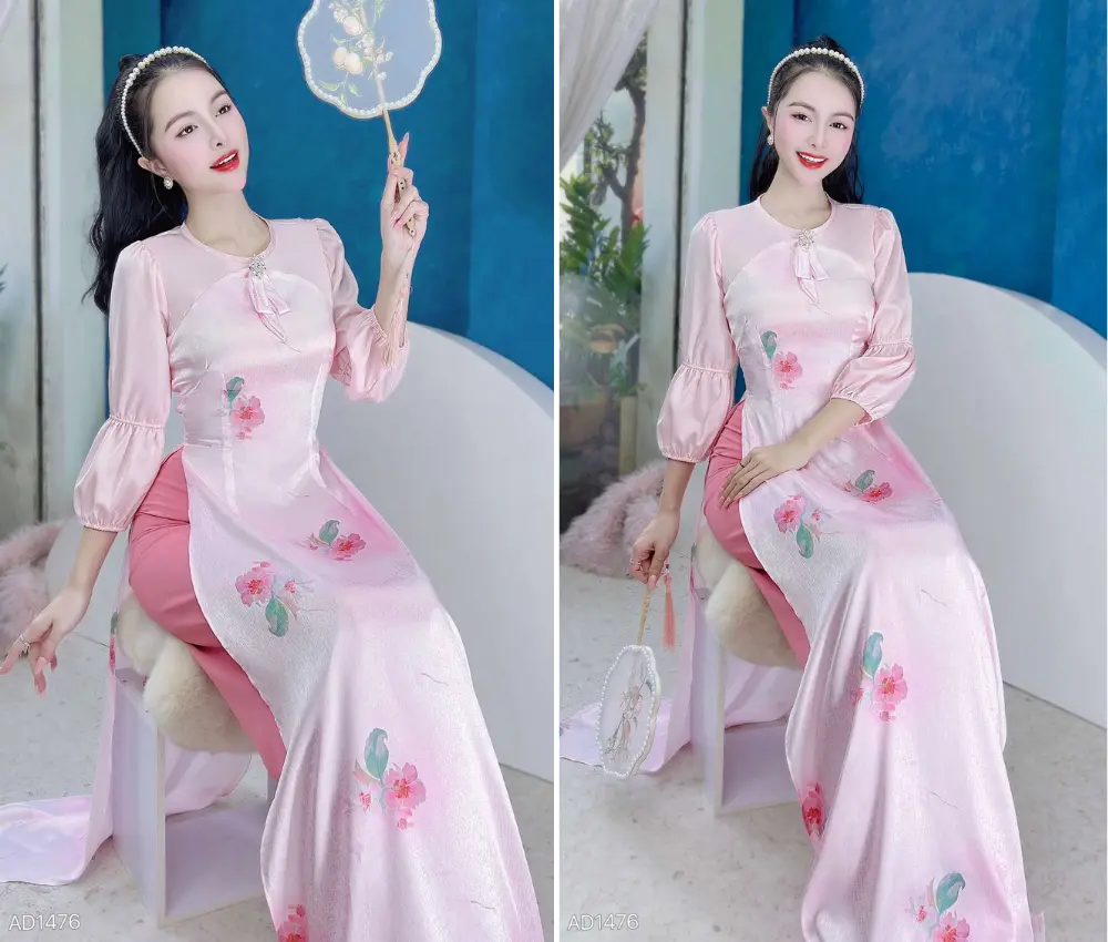 Mẫu áo dài suông tay chung đôi mang vẻ đẹp nhẹ nhàng, thanh thoát với màu hồng pastel ngọt ngào và họa tiết hoa tinh tế. Thiết kế tay áo bồng tạo sự trẻ trung, hiện đại, trong khi chi tiết nơ và đính đá ở cổ áo tăng thêm sự sang trọng. Đây là lựa chọn lý tưởng cho những ai muốn thể hiện sự nữ tính và thanh lịch.